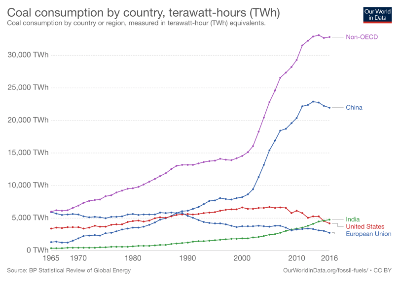 Next consider the plot of global coal consumption, in unit of Terawatt-hours (TWh) of energy. The non-OECD countries in general, and China in particular, are now the major players after a long run in prior decades by the US and EU. This is why the majority of emissions up till now came from the developed world, but going forward the emissions will come largely from the developing world. It looks as though US and EU coal consumption has peaked. Perhaps even China’s has too, but it’s far too soon to be certain there. India is still on the rise. What’s striking for China, however, is the rapidity of the change. The last doubling prior to the recent peak took only ten years.