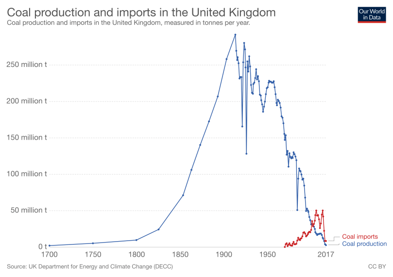 How fast can things change? Consider the plot below from Our World in Data, showing the historical use of coal in the United Kingdom. The UK, of course, was one of the homes of the Industrial Revolution, a place where coal mining formed a large part of the national identity until fairly recently. George Orwell’s book The Road to Wigan Pier provides a compelling look at that Welsh coal-mining world in the decades just before WWII. The up-ramp looks like classic exponential growth until the late 19th century when it slows, and then peaks. The approach to the peak in 1913 took about forty years for the last doubling, while first halving on the way down took until the early 1970s. If this pattern holds for fossil fuel usage in general, then it looks like we will be addicted to fossil energy sources for much of the 21st century, too. Is that the case?