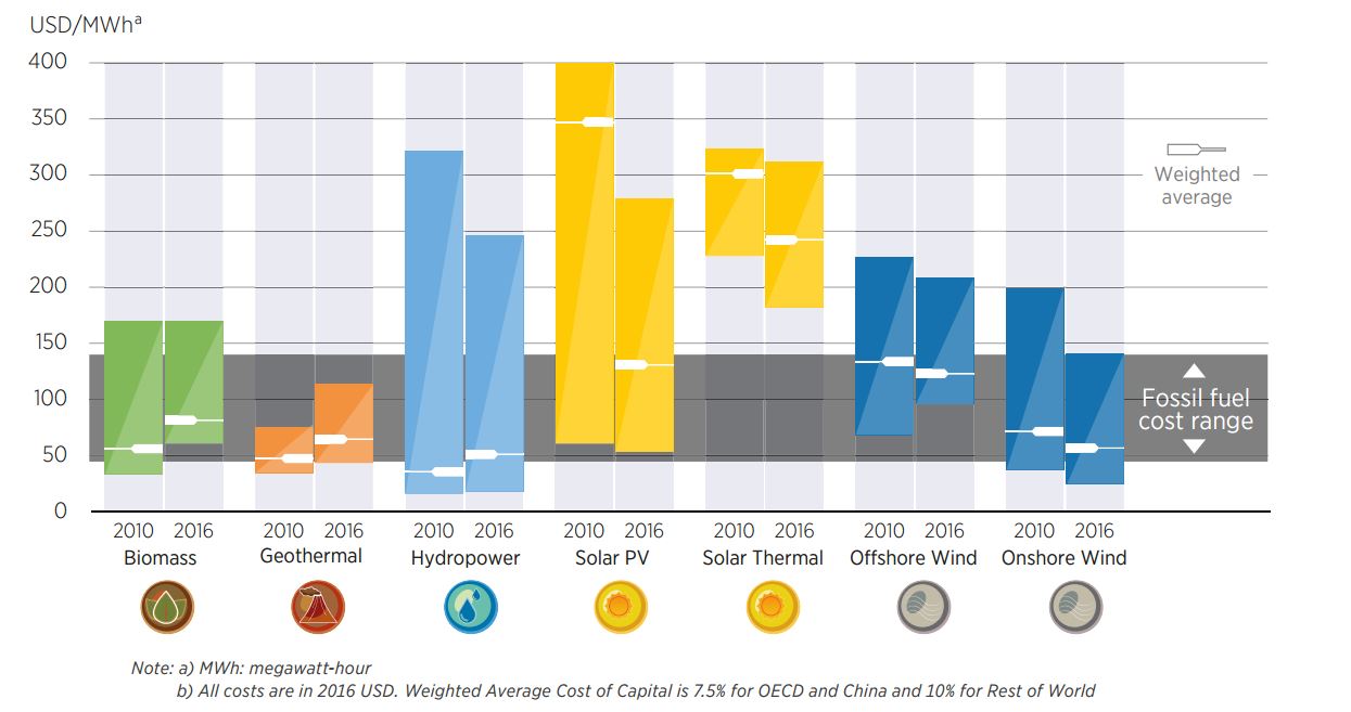 For example, consider the following chart from the International Renewable Energy Agency (IRENA) report Rethinking Energy: 2017. Many analysts believe studies like this provide evidence the transition to low-carbon power may be about to accelerate. A more recent report from IRENA includes projections out to 2022, showing the cost of renewables continuing to decline as measured by current contracts for new projects just getting underway.