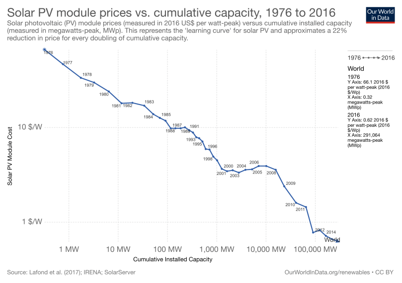 The large expansion in coal power in China in the late 20th century has been bad news for air quality there, and therefore China has now embarked on a rapid expansion of solar and other renewables. Can China ramp down coal consumption at the same rate they ramped up? Time will tell. But there are reasons to think the global transformation toward a lower-carbon economy will be more rapid than the UK experience with its transition away from coal. This is because we are now a global society, and we learn from one another. This is a cause for hope. The Chinese and the developing world don’t have to repeat the same mistakes, or cycle through the same generational sequence of technological change as the US and EU. They can hop forward to better technologies than the US and EU had at similar stages of economic development, if those technologies are on offer. Are they already here?