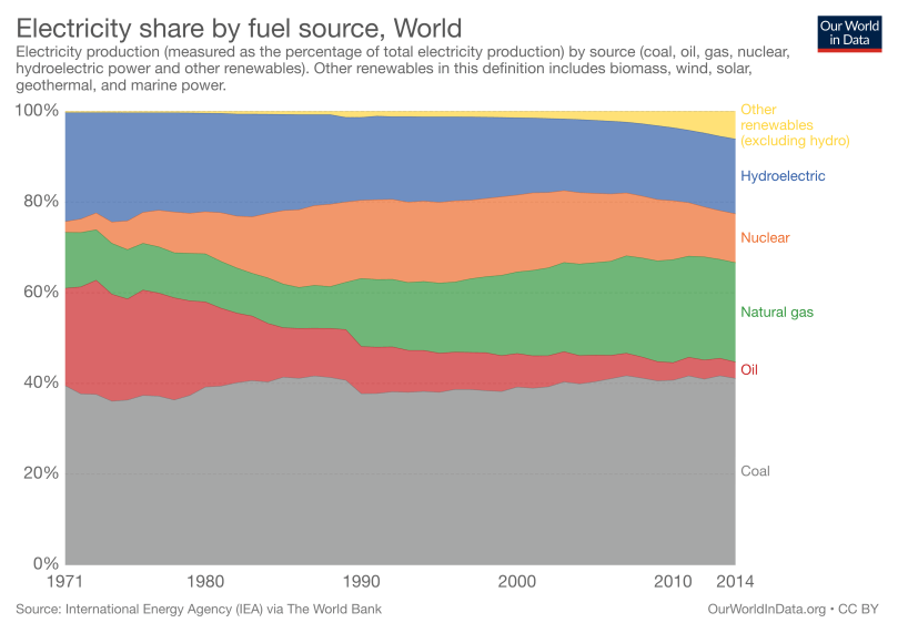 Analysts like Ramez Naam of Singularity University, Tony Seba, or those at think tanks like the Carbon Tracker Initiative, Energy Innovation, and the Transition Pathway Initiative at the London School of Economics, believe we might be at a ‘tipping point’ for electric power generation. Consider the historical chart below, which shows the relative fraction of different power sources. Note that we currently get very little power from oil. Energy analysts believe that a large shift toward renewable energy as a source for electric power will most likely take market share away from coal, nuclear, and natural gas.
